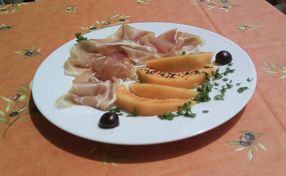 Der erste Gang: gemischte mediterrane Antipasti mit gegrilltem Gemüse, Salami, Rohschinken, Käse, Olivenöl, Kräuter. Ein toller Einstieg und geschmackvolle Ergänzung zu den Rotweinen. Besonders interessant zu erleben, wie das Fett der Fleischwaren, die Tannine der grossartigen Rotweine ausbalanciert. Die Gerbstoffe werden angenehm weich und rund.